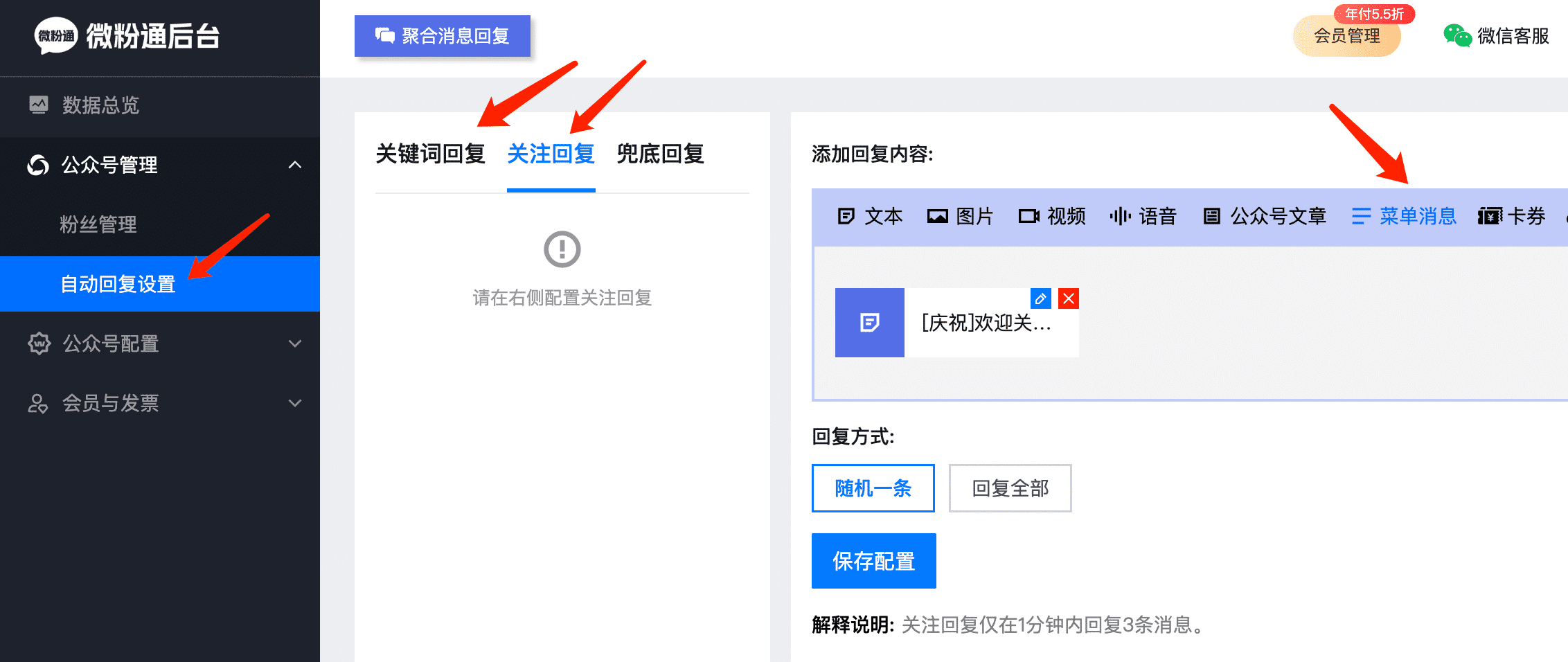 - 3、点击左侧公众号配置 - 点击自动回复设置 - 选择关键词或关注回复 - 选择菜单消息 - 进行配置;
