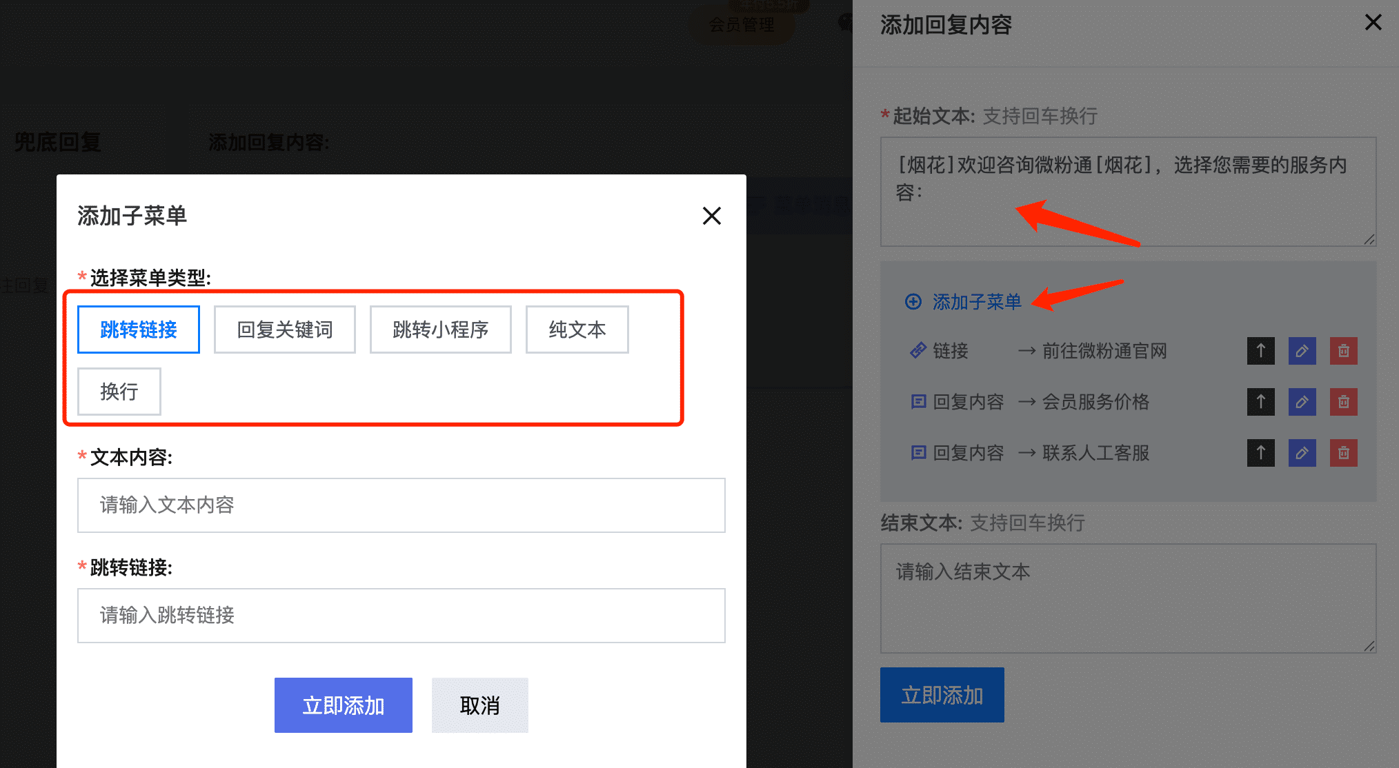 - 4、添加回复内容 - 输入起始文本 - 子菜单内容 - 结束文本等;