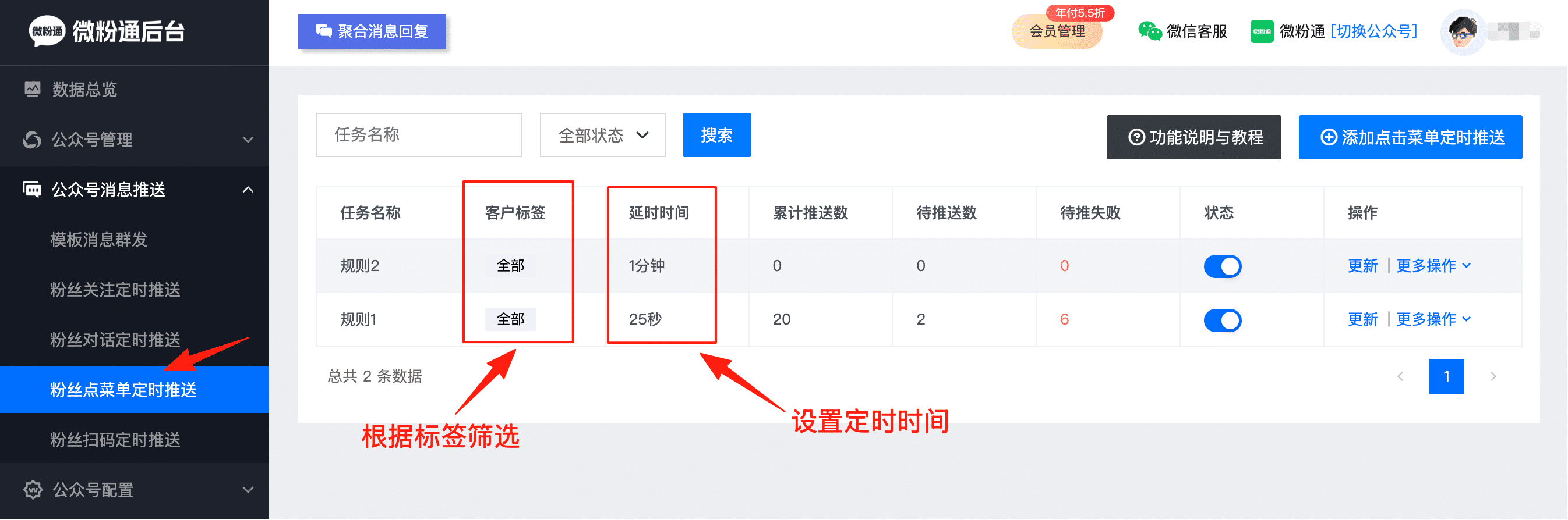 粉丝点击公众号/服务号菜单后,从当前点击时间算起,延迟0秒(即点击菜单立即推送)、1小时、3小时后对这个粉丝定向推送一条或多条信息,从而达到营销转化的目的;包括微信点击自动回复消息、点击跳转链接、点击跳转小程序等均支持定时发送消息。