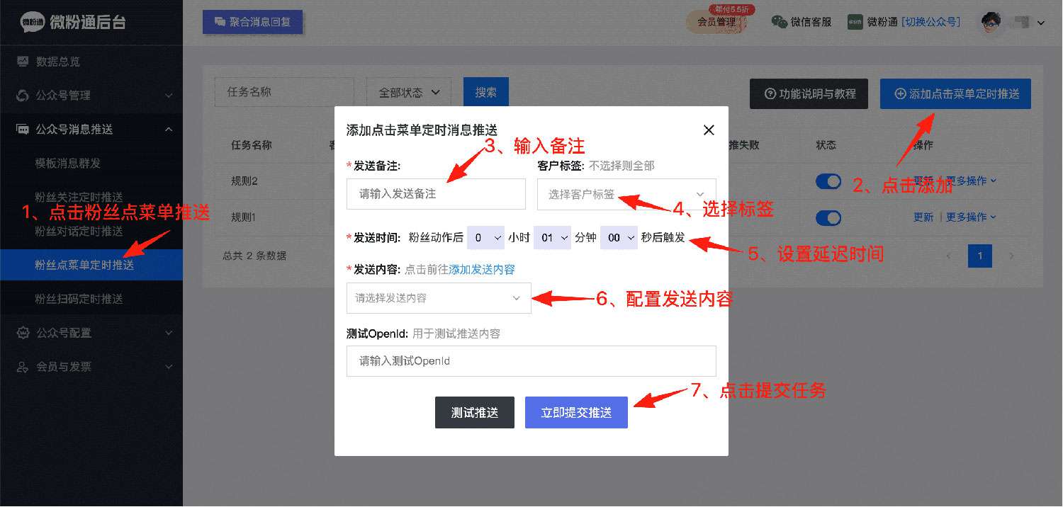 - 3、点击左侧公众号消息推送 - 点击粉丝点菜单定时推送 - 点击添加点击菜单定时推送;