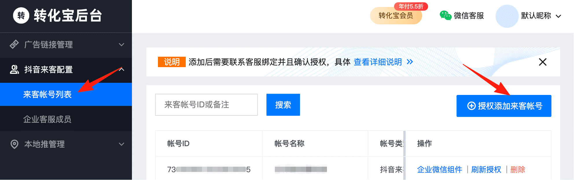 - 2、进入转化宝后台抖音来客配置 - 授权添加来客帐号(参考教程:抖音来客如何授权企业微信获客助手给转化宝?);