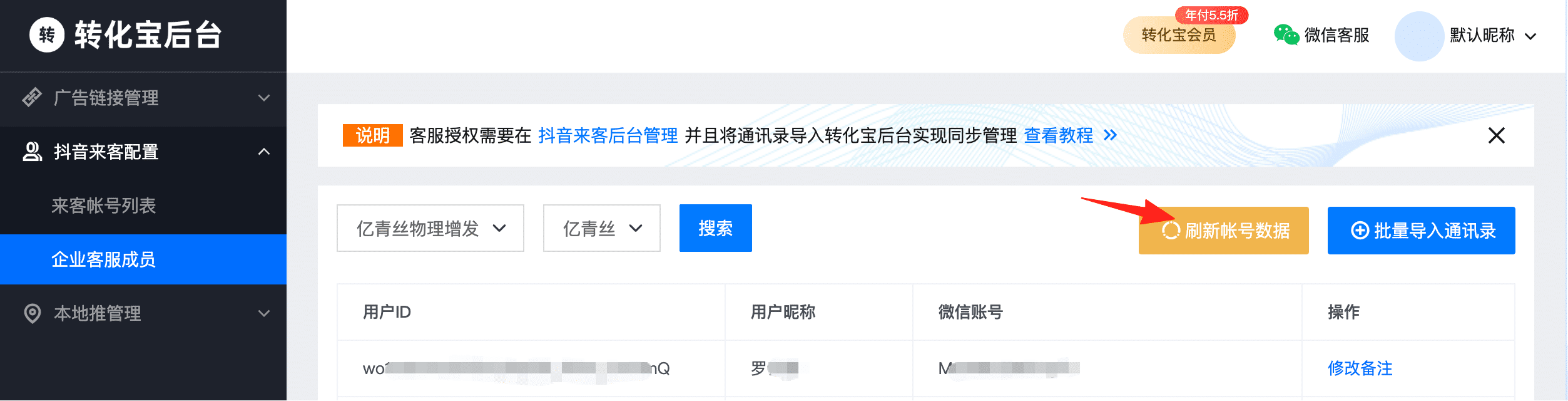 - 3、进入企业客服成员管理 - 点击刷新帐号数据 - 将企业微信通讯录导入(参考教程:抖音来客企业微信获客助手如何增加员工客服?);