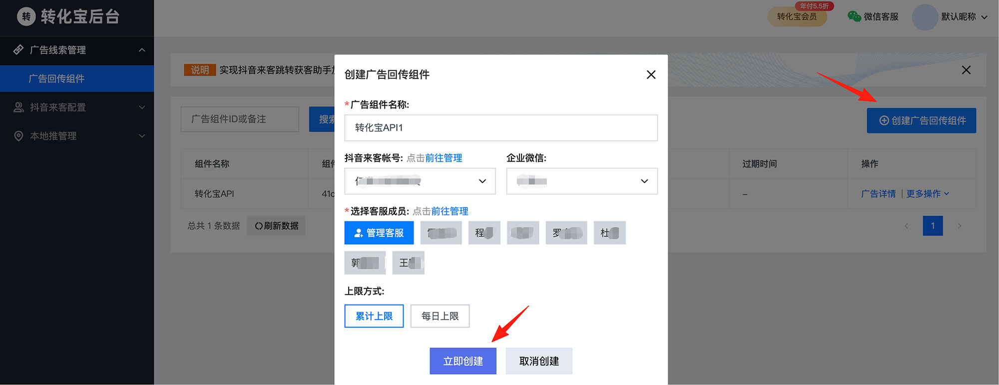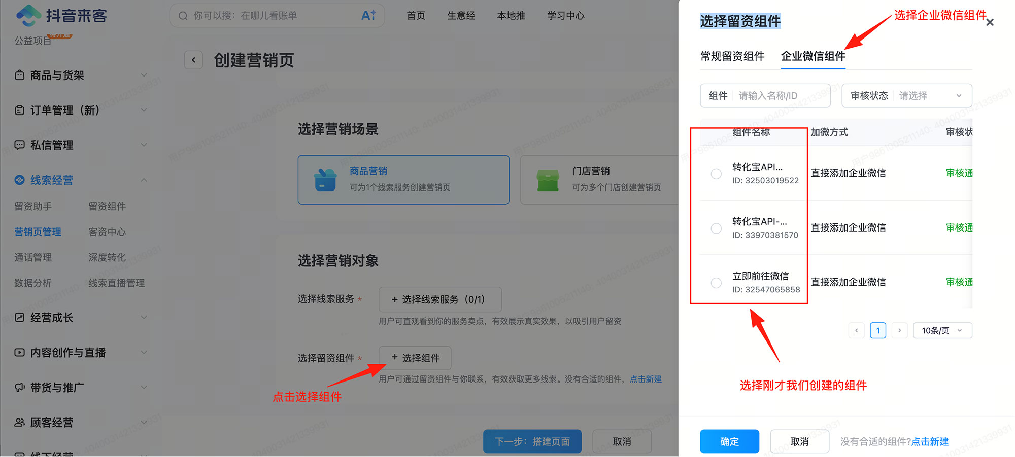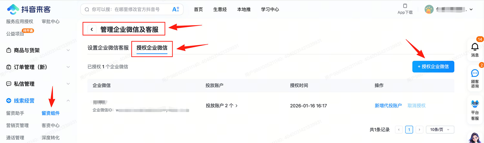 - 4、授权完成即可进入广告线索管理 - 点击创建广告回传组件 - 选择抖音来客帐号 - 选择企业微信(如果没有配置需要提前配置授权);