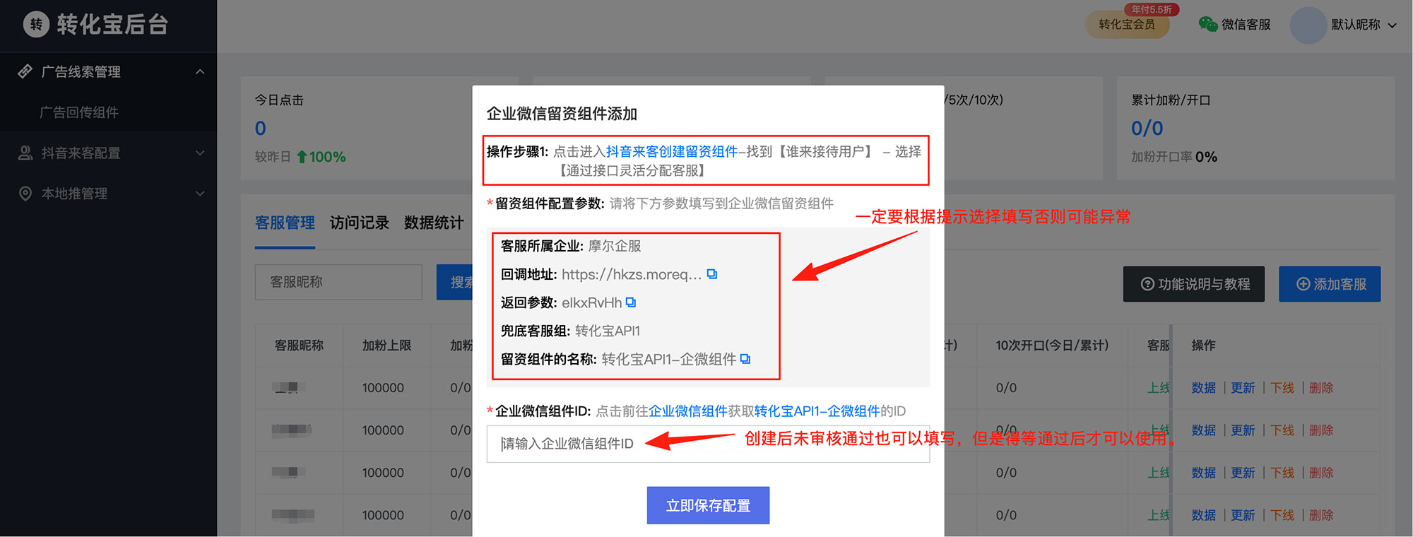 - 6、点击进入抖音来客创建留资组件-找到【谁来接待用户】 - 选择【通过接口灵活分配客服】- 根据转化宝后台提示创建留资组件;(注意参数一定要按照提示的填写否则可能无法正确回传),并且添加后需要审核,您可以提前填写进转化宝后台但是使用一定要在通过后才可以使用。