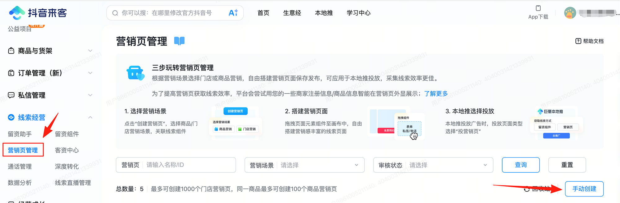 - 7、配置完成后我们进入抖音来客后台 - 点击营销页管理 - 点击手动创建;