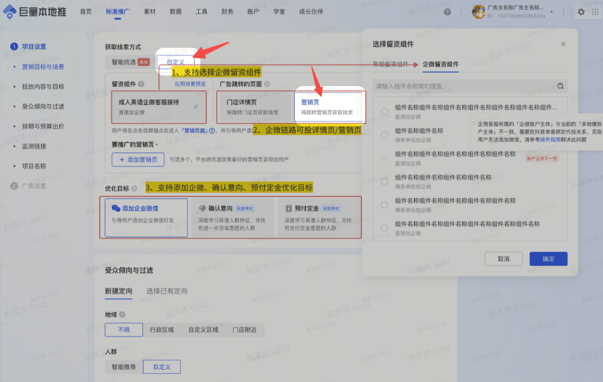 将已发布的企业微信落地页用于本地推线索投放,建议直接投放预付定金(对应196节点):