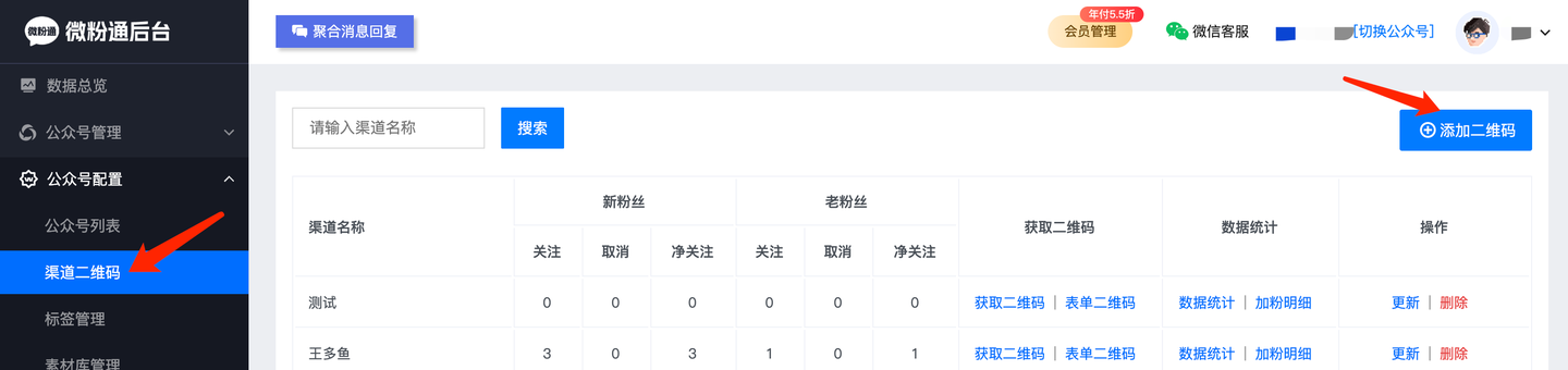 公众号渠道二维码功能包括:渠道码当日粉丝数、取消关注数、净新增粉丝数、粉丝昵称、粉丝信息等,并且通过微粉通后台可以进行关键词、AI自动回复客户,不同的渠道二维码支持打不同标签和发送不同欢迎语。