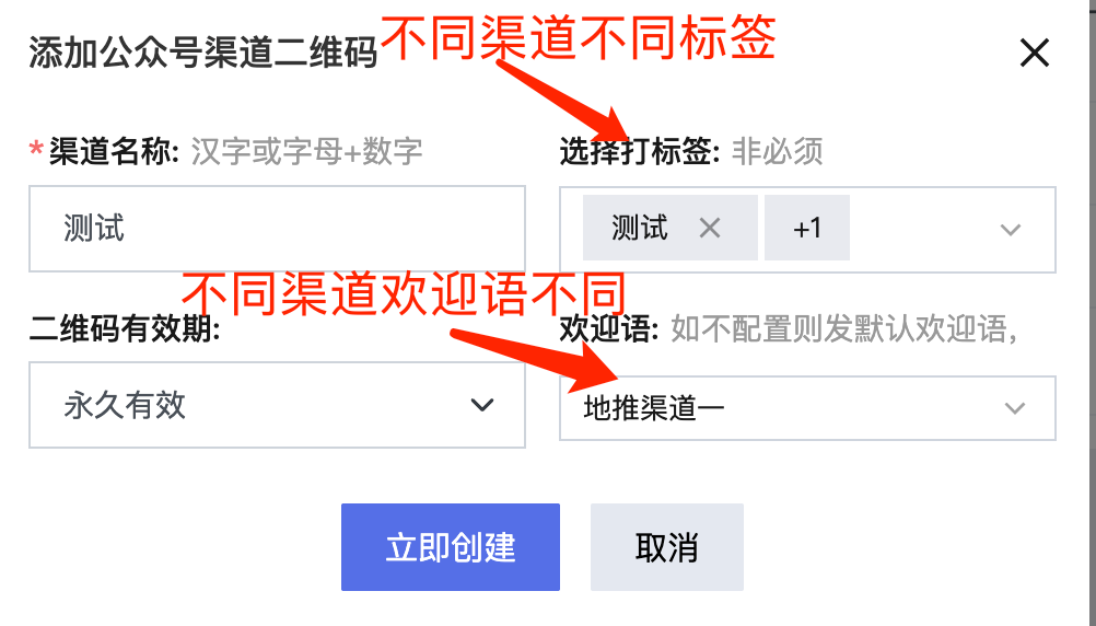 - 4、输入渠道名称、选择标签、二维码欢迎语等 - 点击立即创建;