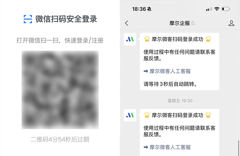 用户扫码后先关注微信公众号,完成登录后公众号会自动发送消息;系统自动完成登录。