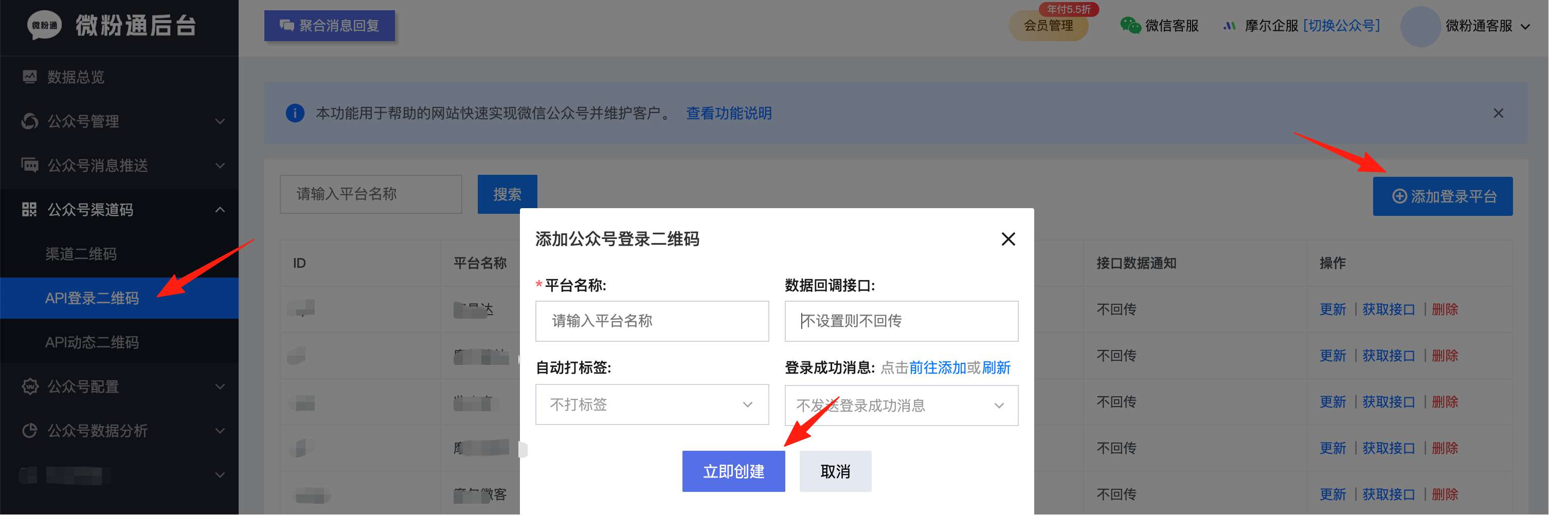 - 2、点击左侧公众号渠道码 - API登录二维码 - 创建登录平台 - 配置关注成功回传接口 - 以及设置自动标签 - 以及设置登录成功欢迎语;