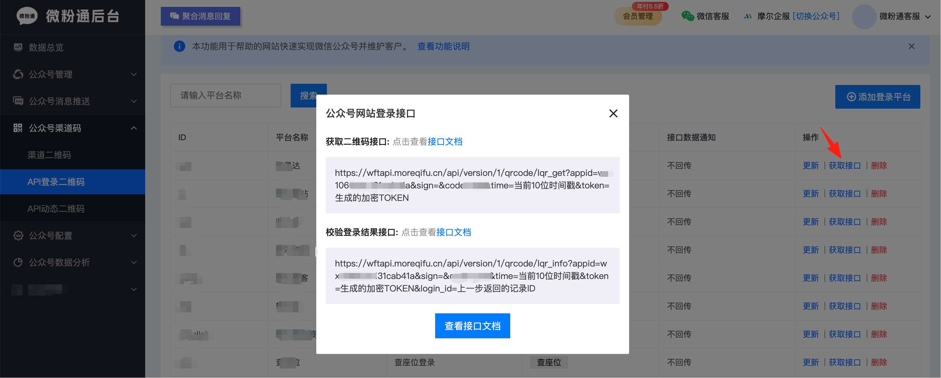 - 3、进入你的网站后台调取接口,目前有2个接口一个获取二维码一个校验登录结果,建议设置成2秒监测一次;