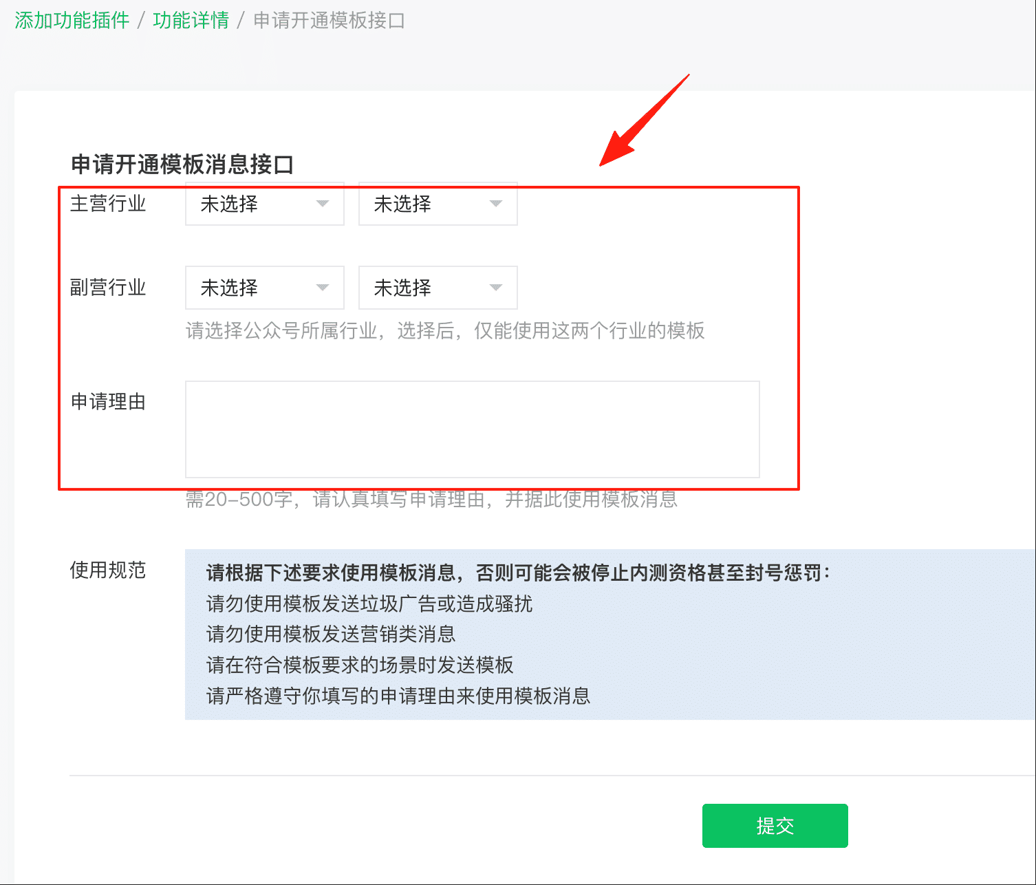 - 3、选择主营行业 - 副营行业 - 申请理由后点击提交即可。