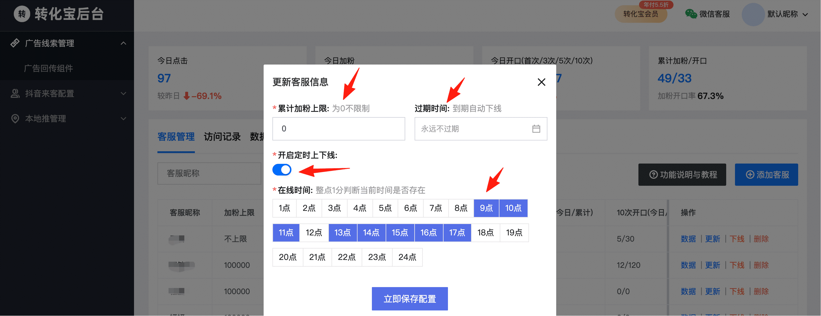 抖音来客企业微信留资组件设置客服每日加粉上限以及定时上下线?