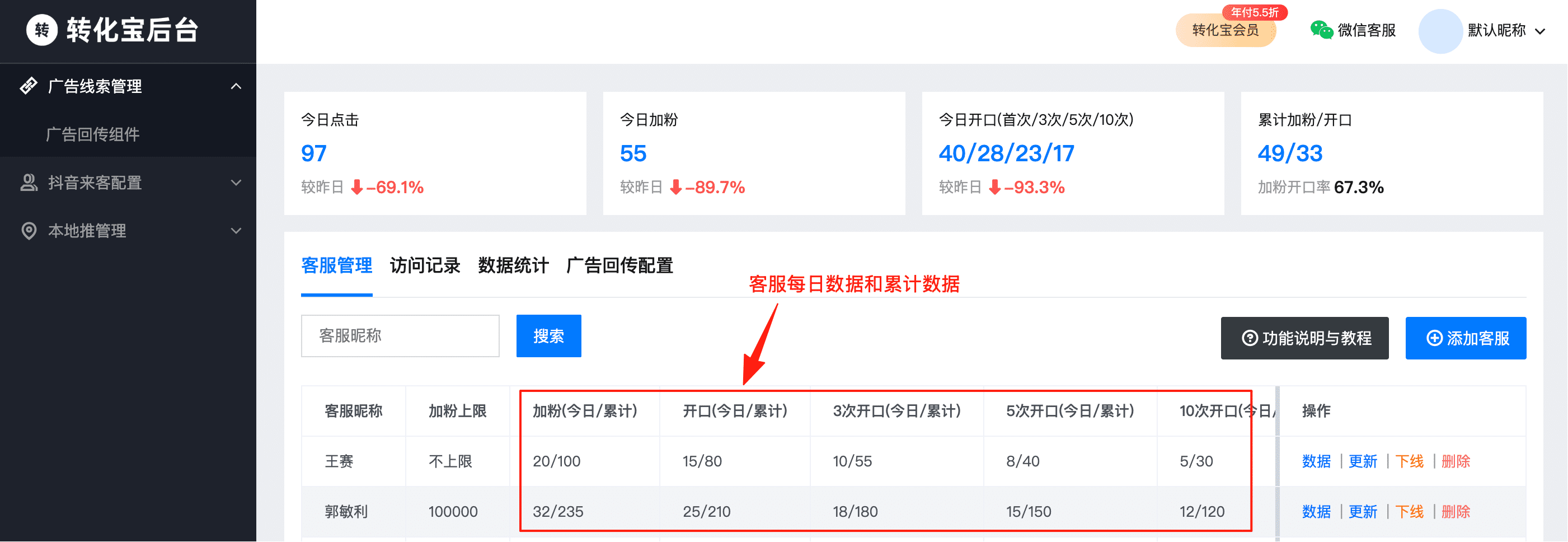 - 1、查看客服每日加粉/累计加粉数据;