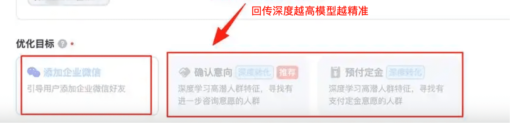您可能投放的就只有进入私信或者提交表单,具有企业微信组件功能的商户可能只投放了成功加粉,这样您的推广模型就不会精准,质量自然就差了。